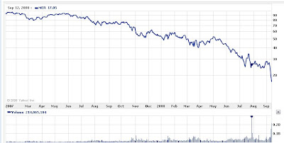 I wasn’t paying attention Friday, when MER dropped to $17.05. I couldn’t have rolled it over fast enough to sell in a panic, anyway. Now comes Bank of America offering $29 a share in a stock-for-stock transaction, which means that like all of the folks I still know at Merrill, I’m hoping BAC doesn’t crater when the market opens in about 60 minutes.