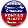Palin may have gone too far herself in mocking community organizers in her acceptance speech. Less than a day after Palin’s speech, Daily Kos launched the meme of Jesus vs. Pontius Pilate, and it’s gaining a lot of traction. On Facebook, if you search the popular Flair application for “Community Organizer,” you’ll find more than two dozen buttons making this point. The button at left is the one that comes up first, indicating more people have chosen that than any other similarly themed button. I mention this because this button was created by my wife Nina, whose graphic design skills led her to design a button more readable than the alternatives, featuring a red-blue color scheme that helps tell the story.