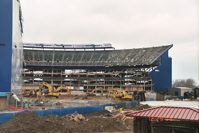 My friend Dennis was wandering with his camera one day in late December and snapped this photo of Shea Stadium, in the process of being disassembled.