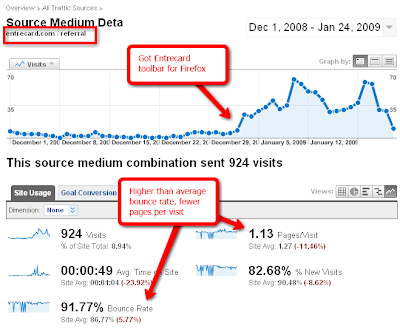 This means members have an incentive to whip through up to 300 sites as quickly as possible, finding and clicking on the widget and then moving on. Not exactly a quality visit — the traffic source table above shows that Entrecard visitors viewed the fewest pages per visit of any of the top traffic sources. (Interestingly, Instapundit visitors were not much higher.)
